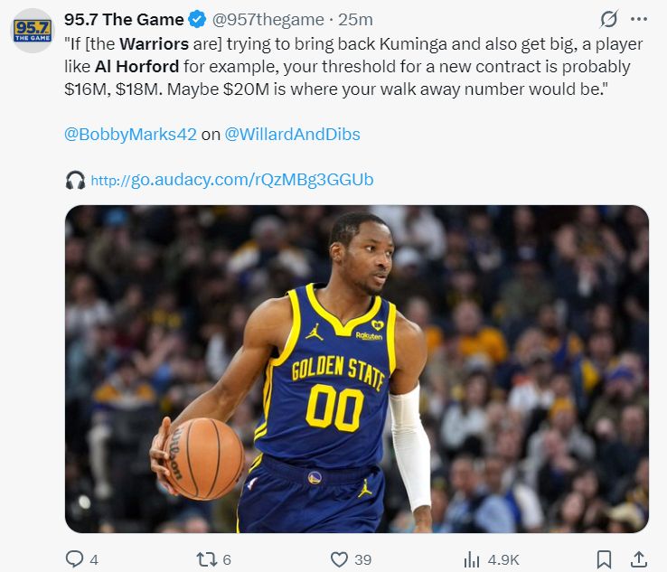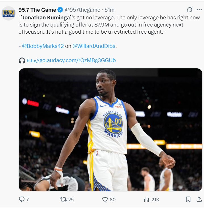 北京时间7月3日,勇士记者WillardAndDibs与ESPN薪资专家鲍比-马克斯在播客节目中谈到勇士队的困境:如果勇士队试图召回库明加并且还想签下霍福德这样的内线,那么勇士给库明加的起薪或许是1600-1800万,2000万的起薪可能都给不了。