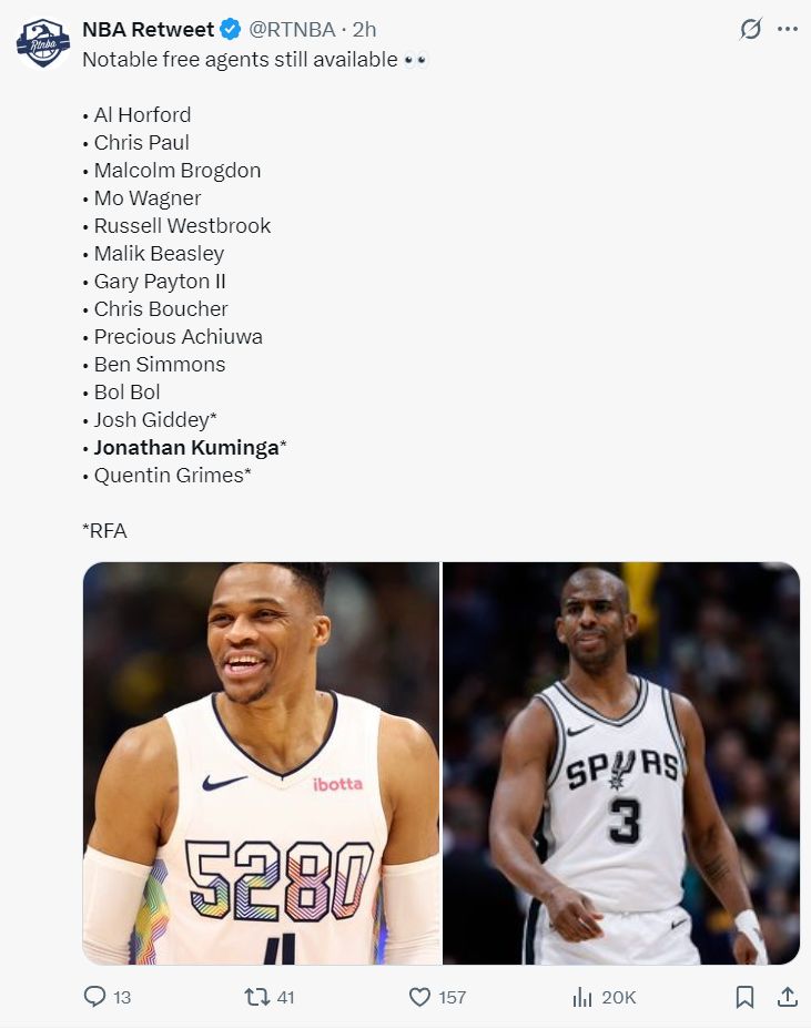 目前自由市场上还存有14个优质的自由球员:霍福德、保罗、布罗格登、大瓦格纳、威少、比斯利、小佩顿、布歇、阿丘瓦、西蒙斯、波尔、吉迪、库明加、格兰姆斯。
